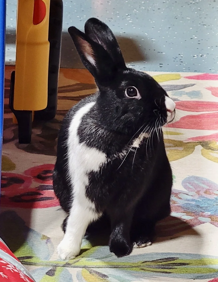 We adopted Milo from Wayward Rabbits in SC in August 2024 after they rescued him from being dumped outside. Wayward Rabbits and the foster home did an excellent job caring for him and he soon came to us for a speed dating session in which he showed some promise with our Molly. His name at the time was Blue because of his gorgeous blue eyes, but since we already had a Bluebell, we named him Milo. Milo and Molly are super happy together and we are super happy to have this gorgeous, sweet bun! -