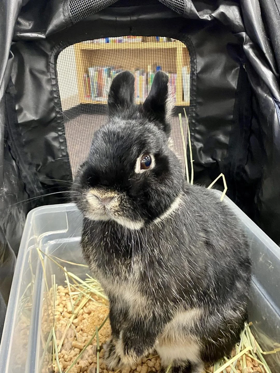Harley was rescued by Bunny Blessings volunteers on May 20, 2022 from the Belmont Urgent Vet. Someone found the baby bunny in a dilapidated cage with a wet towel and no food or water. The vet estimates that Harley was about 4 weeks old. Our volunteer brought Harley to the Bunny Barn where he was loved and cared for. Another volunteer fell ears over paws in love and bun-napped Harley to her home where he continues to live the good life. He loves to give kisses and snuggle. He also loves to do zoomies, binkies and crash loudly into things at about 5:30 am each morning. He loves to shop for greens at Aldi, to attend events and share cuddles and kisses with anyone who will hold him! In spite of his tough beginning, he has become a loving addition to the ministry! -
